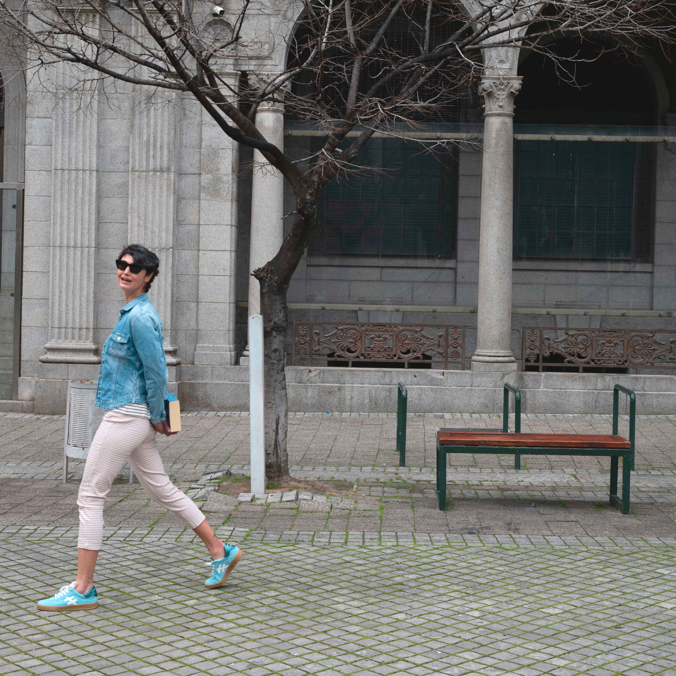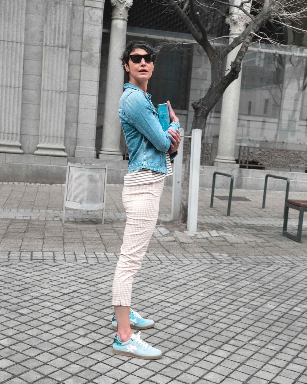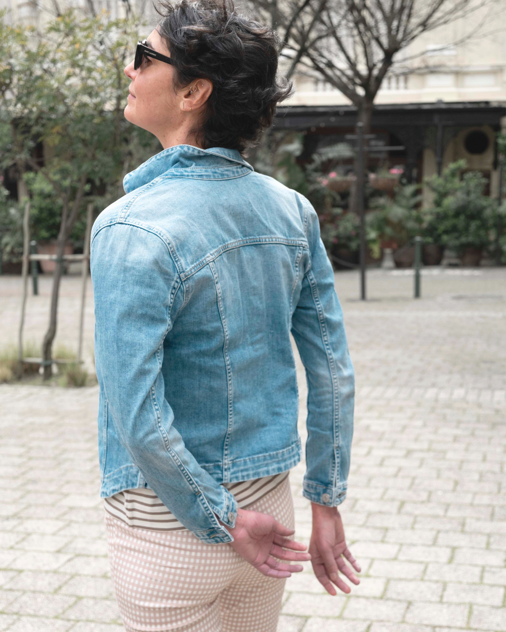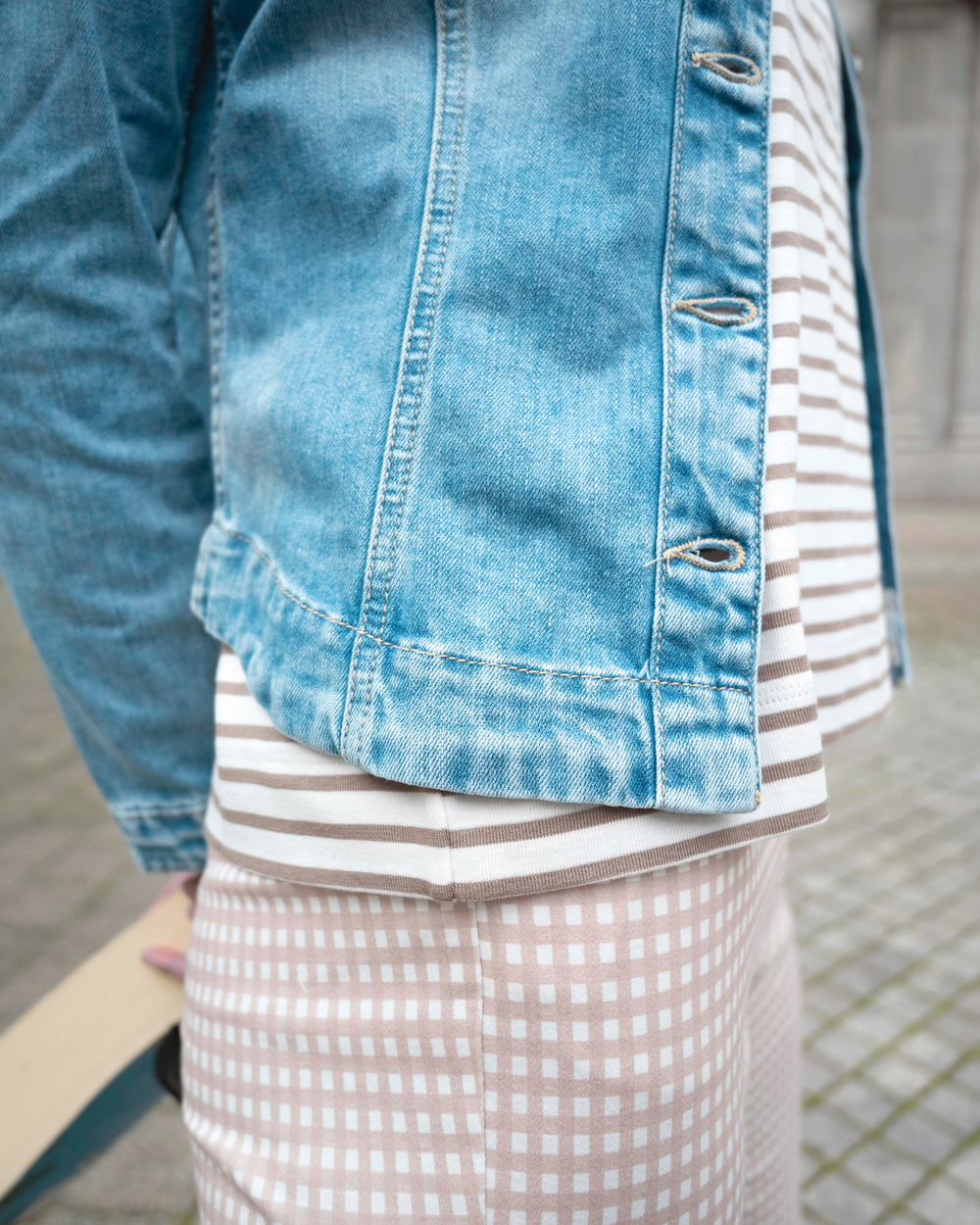 Attraversiamo - let’s cross over. Sky blue for spring and Y2K-inspired capris reimagined for the now with a subtle pairing of stripes and squares, and a staple denim jacket (because we all know the winter chill hasn’t left yet.)