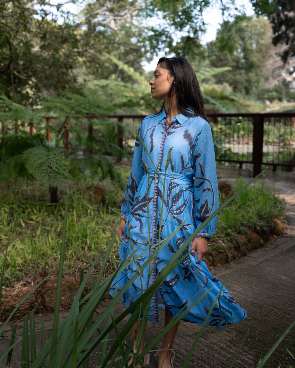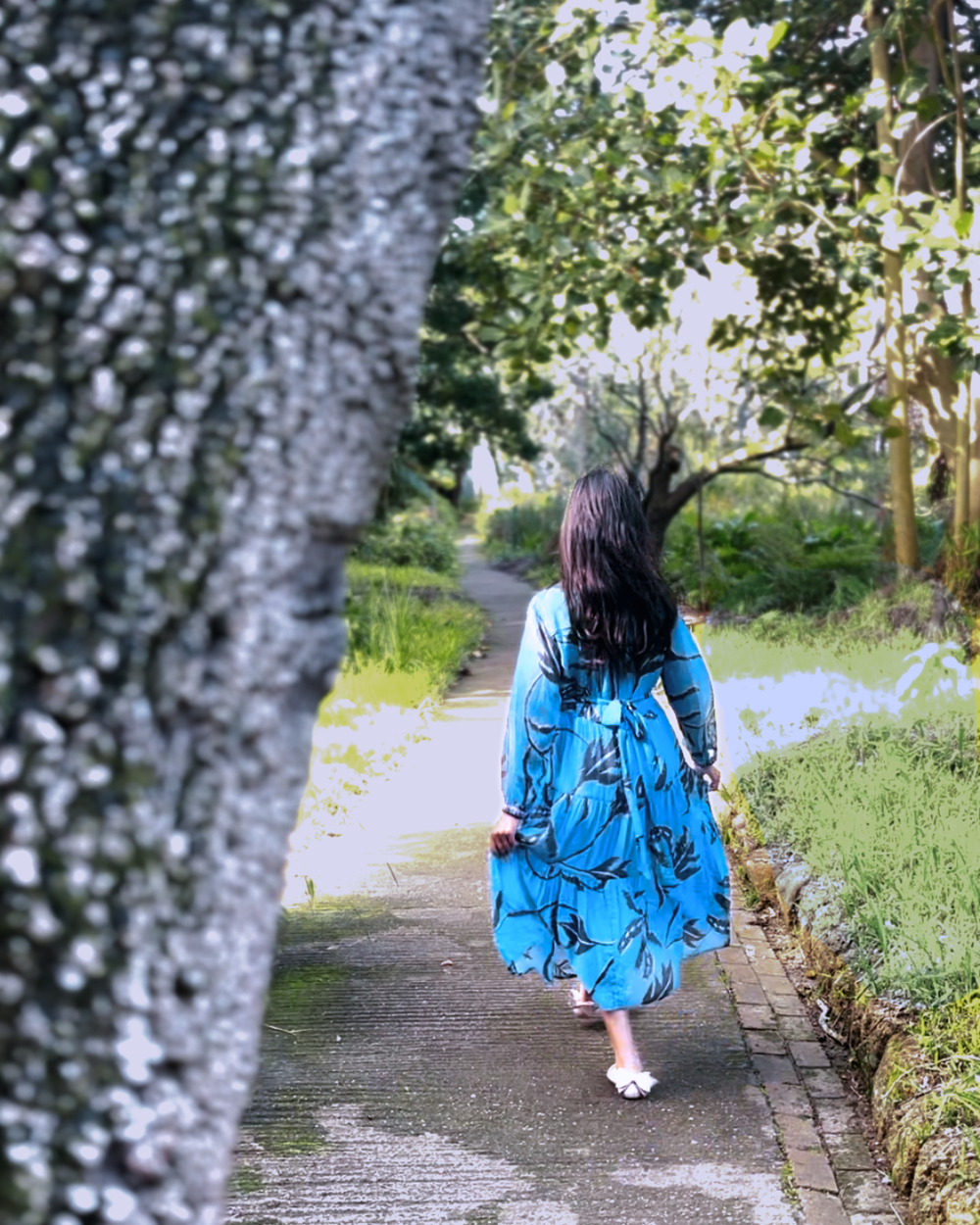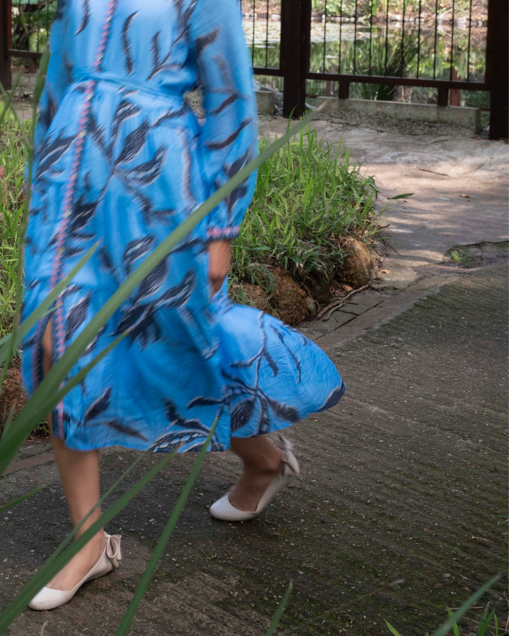 This sky blue dress dances with the breeze, singing spring’s quiet magic with every step. A garden spell is cast in the dappled sunlight.